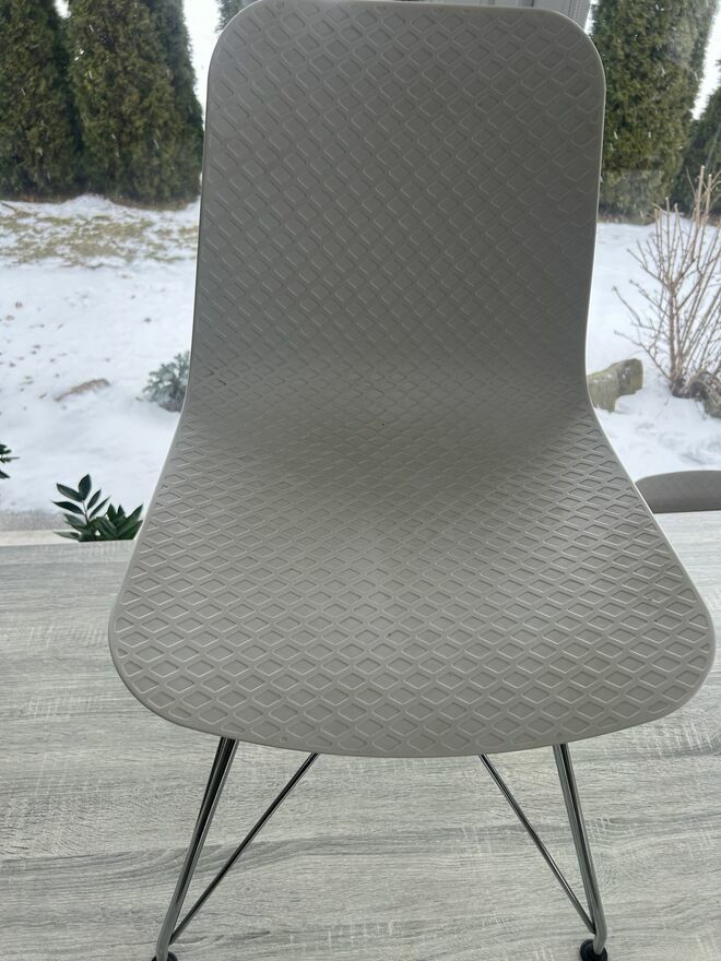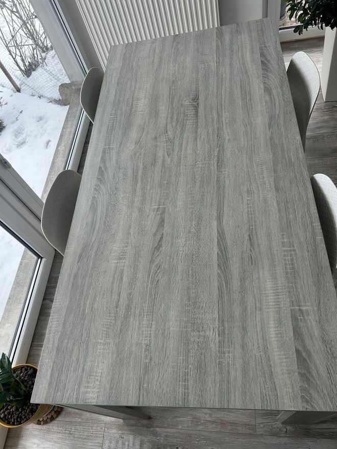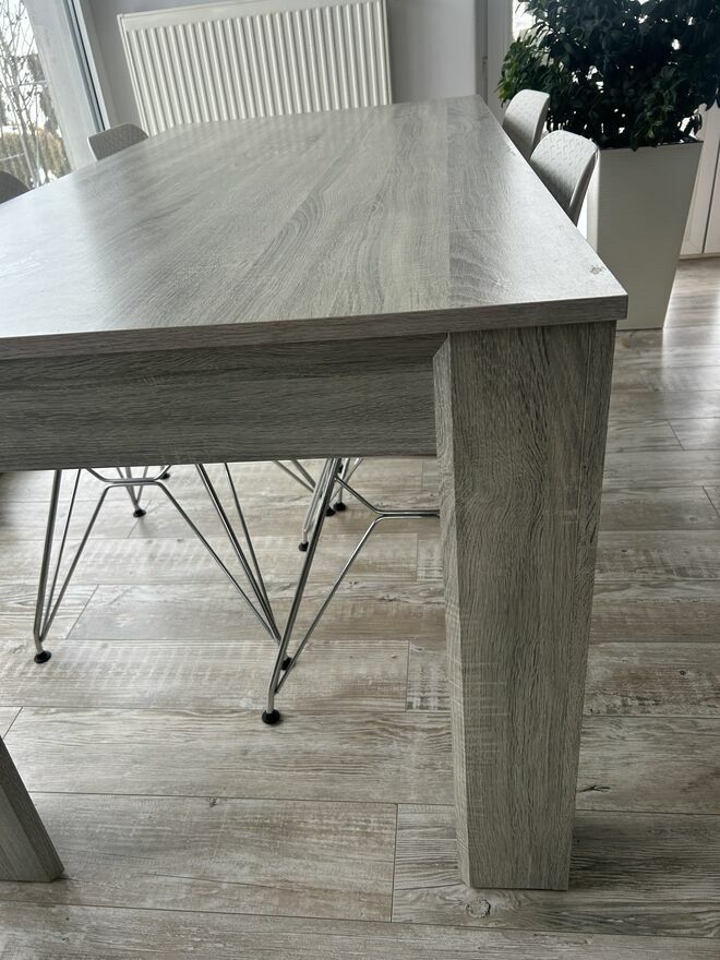 WitamOferuje do sprzedaży stół ze stołkami w kolorze szarym i bieli.Na środku stołu małe niezbyt widoczne odparzenie.